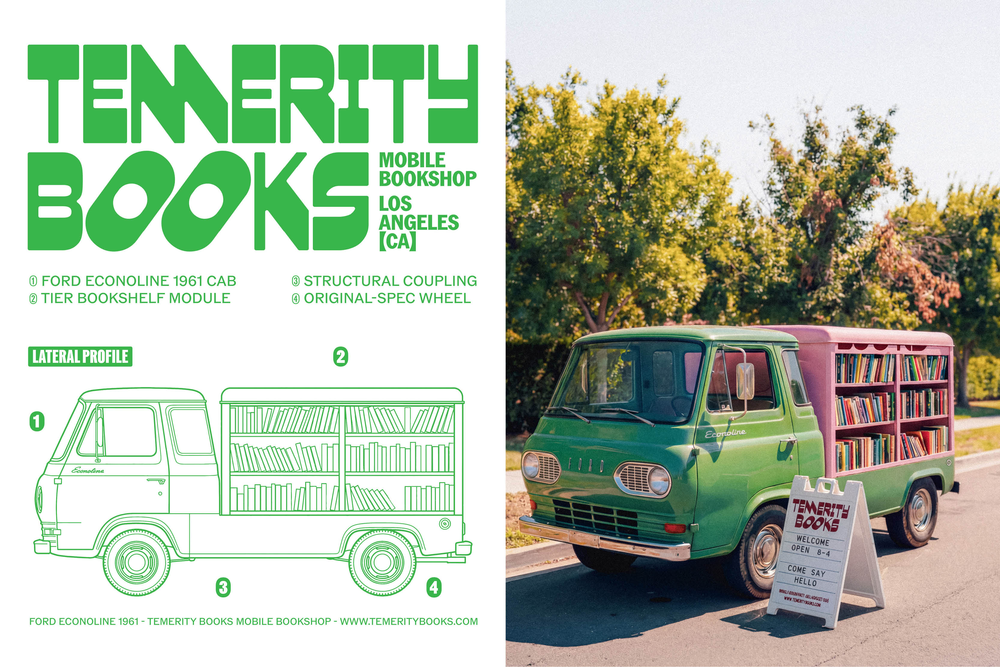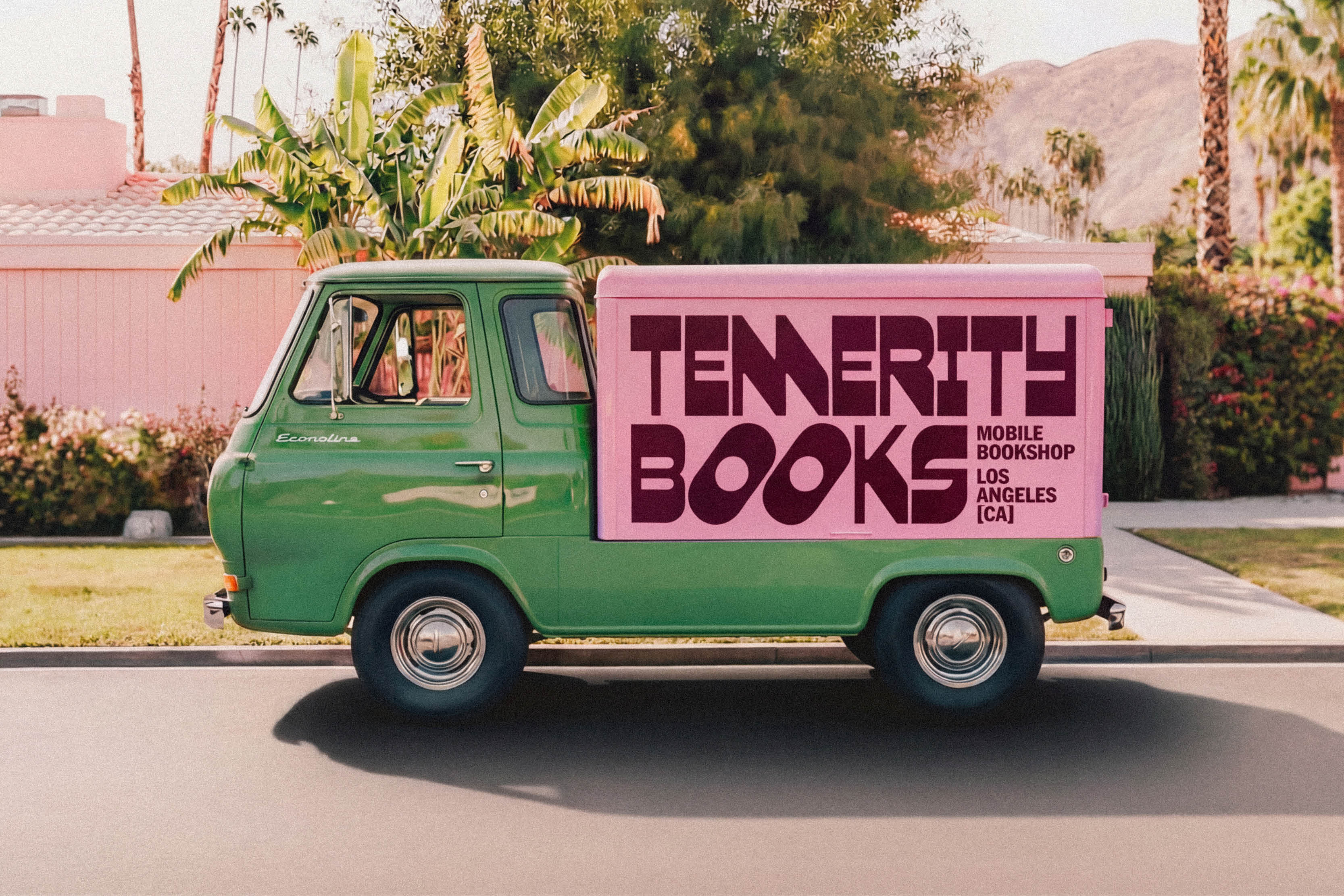 (EN) Brand identity for Temerity Books, a mobile bookstore in Los Angeles that views reading as an act of resistance. Against censorship and for silenced voices, the project transforms a 1961 Ford Pickup into a catalyst for curiosity. A visual system based on "quiet rebellion": 70s typography, playful energy, and an extension from asphalt to everyday life. Temerity is the courage to pause in a fleeting world.